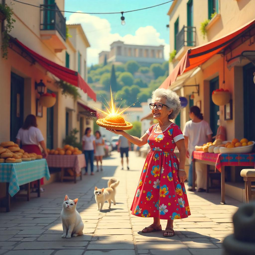 In einem kleinen gelben Haus am Hang des Lykabettus, dort wo die Gassen von Athen so steil sind, dass selbst Katzen beim Klettern schnaufen, lebte Großmutter Filoméni – 82 Jahre alt, 1,48 Meter groß und gefährlich bewaffnet mit einem Holzlöffel und einer scharfen Zunge.