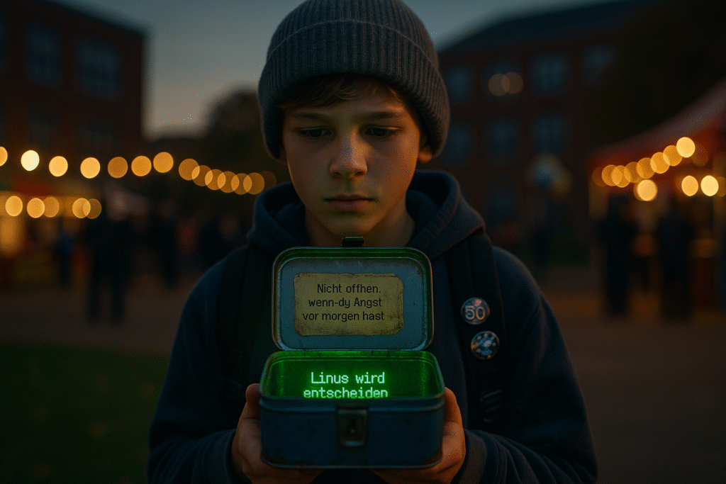 Linus zuckte mit den Schultern und öffnete die Dose. Nichts passierte. Doch als er hineinschaute, war dort ein kleiner Bildschirm. Darauf flimmerte in grüner Schrift: „Donnerstag, 14:32 Uhr – Linus wird stolpern, fallen und jemanden retten.“
